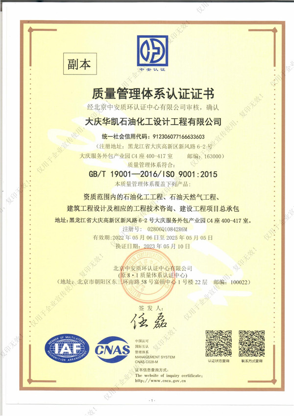 近日,我司順利通過質(zhì)量管理體系認證,這標志著華凱公司在項目質(zhì)量體系建設上已經(jīng)達到了相關標準。質(zhì)量管理體系認證證書的取得同時也是公司各項管理工作的規(guī)范化、標準化的體現(xiàn),是對公司持續(xù)穩(wěn)定健康發(fā)展的重要保證。我們將進一步優(yōu)化和規(guī)范各項管理制度,不斷提高體系運行的有效性,不斷提高公司的管理水平,共同推進公司的快速發(fā)展。自此,華凱公司質(zhì)量管理體系的標準化、規(guī)范化及科學化又邁上新臺階。